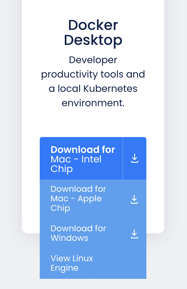 - 도커 홈페이지에 접속해서 docker를 다운받아주시면 됩니다. 컴퓨터 운영체계에 맞는 docker를 다운받아 주시면 됩니다.