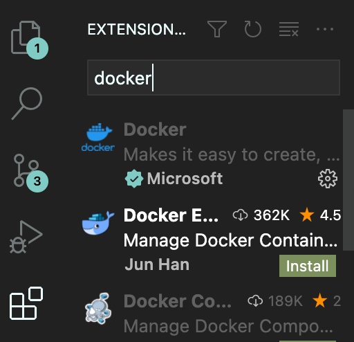 - Visual studio에서 extension에서 docker를 install 해주기.