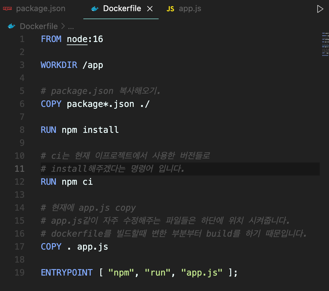 - RUN을 이용해서 package json을 install 해줄 수 있습니다.