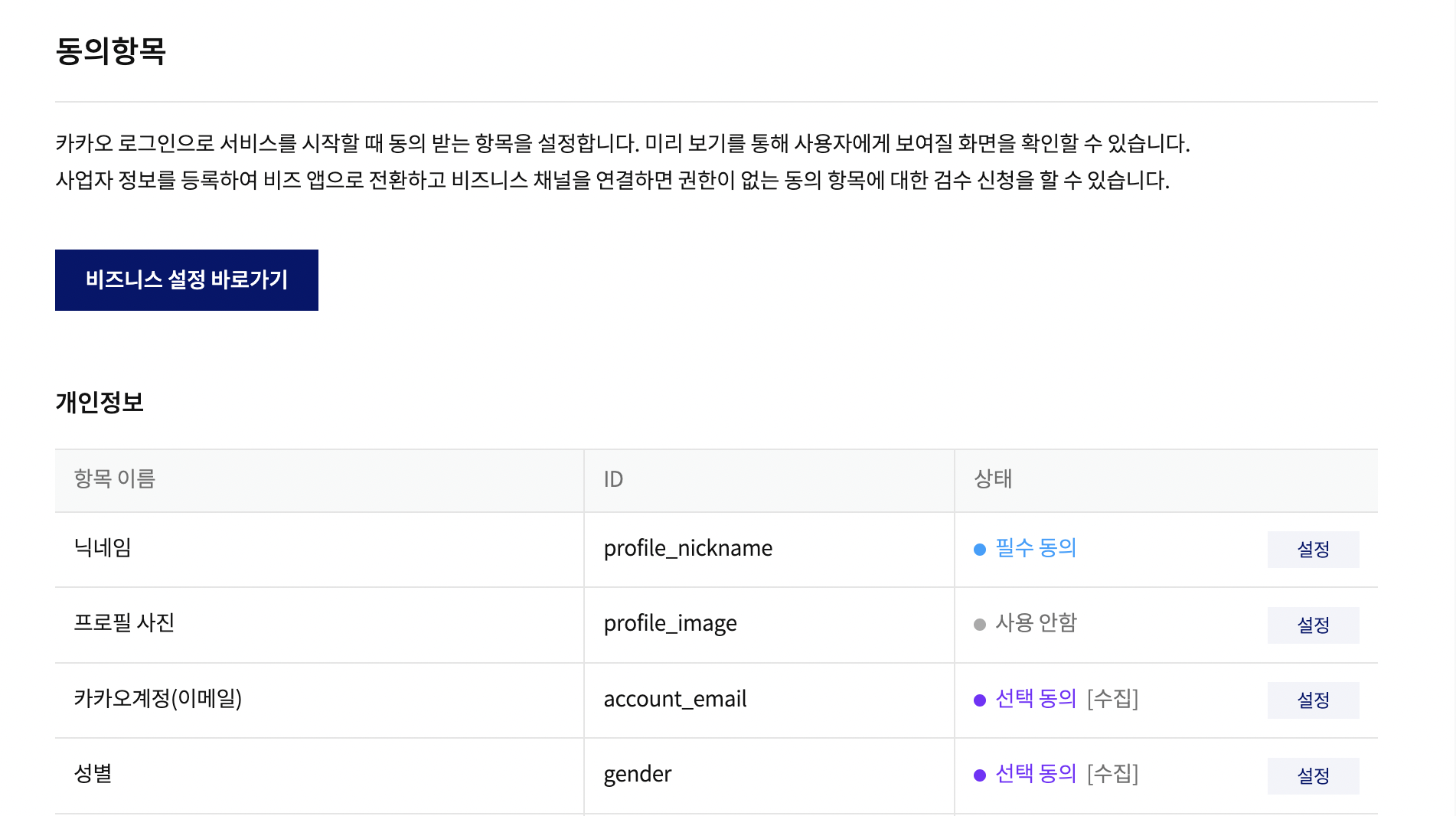 개인정보란에 닉네임, 프로필 사진 등 내 사이트에서 KAKAO로 회원 가입할 때 넣어줄 개인정보를 설정할 수 있습니다.