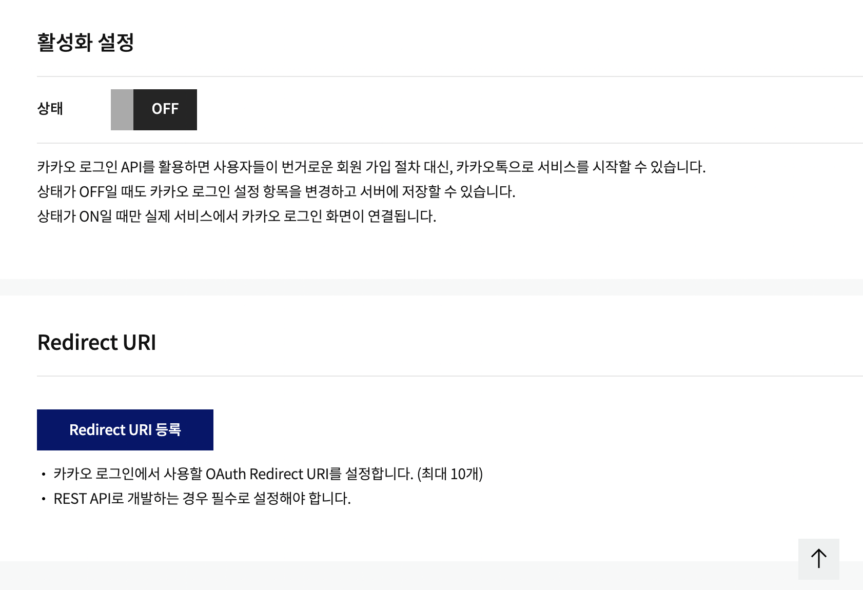 활성화 설정에서 상태를 On 으로 바꿔줍니다. Redirect URI는 로그인한 후 인가 코드를 받을 곳으로 redirect 시켜주는 URI입니다.