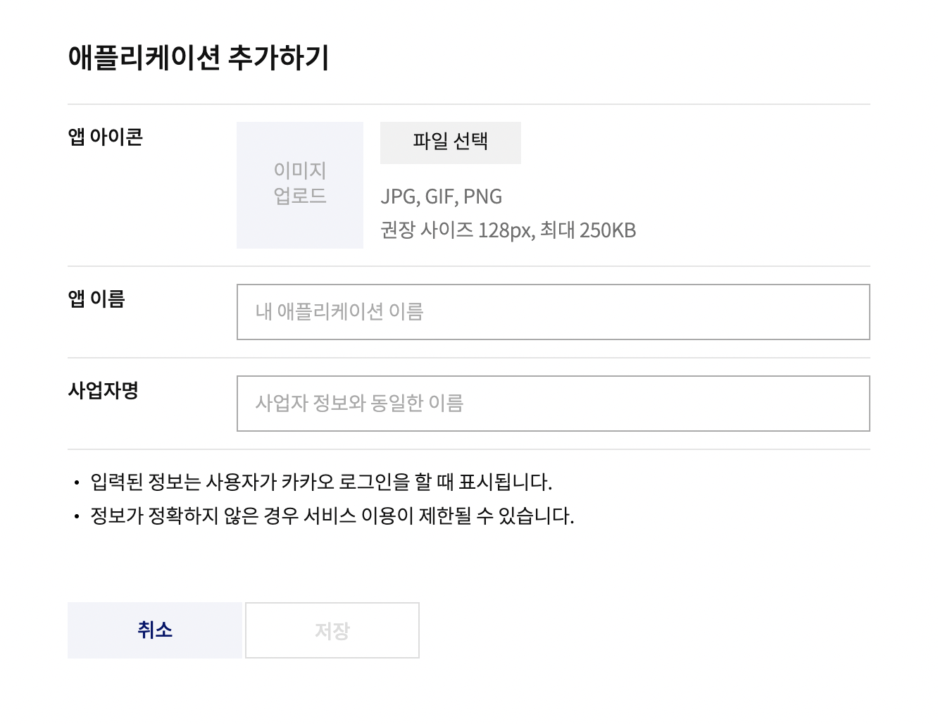 2. 카카오톡 시작하기 -> 어플리케이션 추가하기 클릭 -> 앱 이름, 사업자명 입력하기