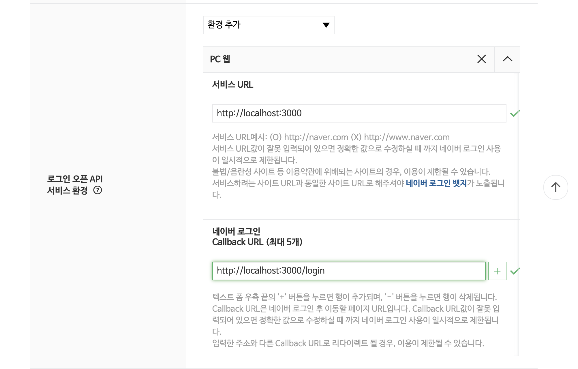 로그인 API 서비스 환경 - callback URL(로그인 후 리다이렉션 url) 후 등록하기