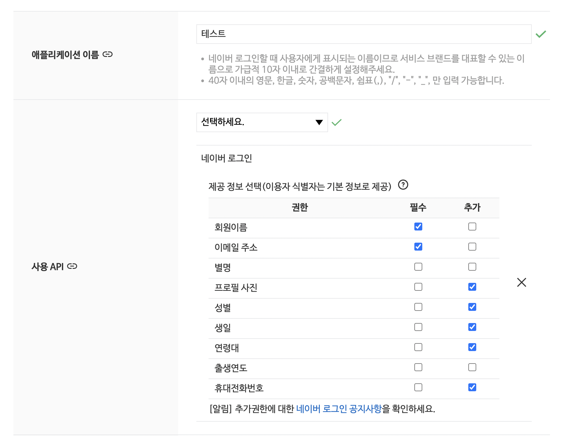 2. 애플리케이션 이름 작성, 사용 API - 네이버 로그인 (내 프로젝트에 필요한 제공정보 클릭)