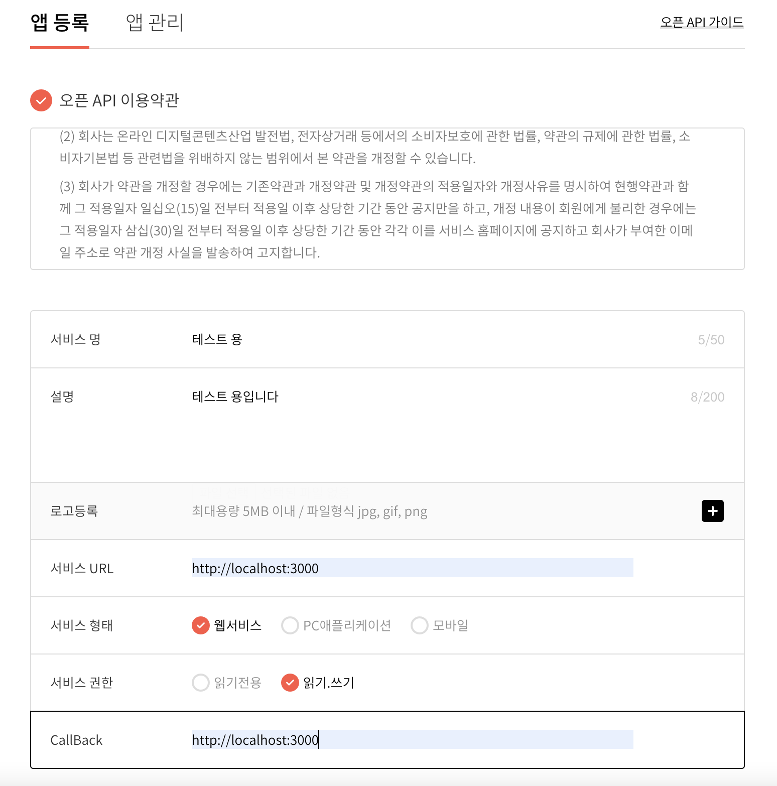 오픈 API 이용약관에 대해 동의를 눌러줍니다. 서비스 명과 설명을 잘 적어주고 서비스 URL에 해당 서비스 URL을 적어 주고, CallBack URL에는 데이터를 요청해서 받은 다음 어디로 URL로 보낼지 적어주는 곳입니다.