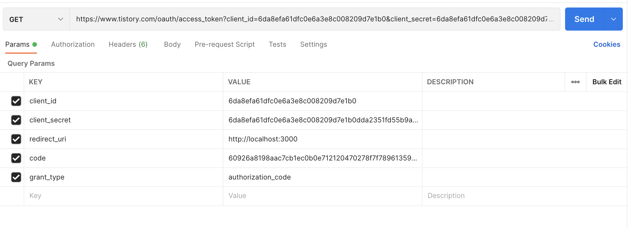 https://www.tistory.com/oauth/access_token?client_id=6da8efa61dfc0e6a3e8c008209d7e1b0&client_secret=6da8efa61dfc0e6a3e8c008209d7e1b0dda2351fd55b9a35b04133ba5b120b80bb993c1e